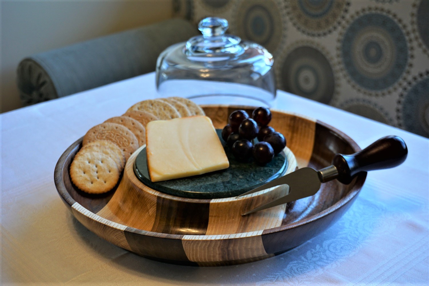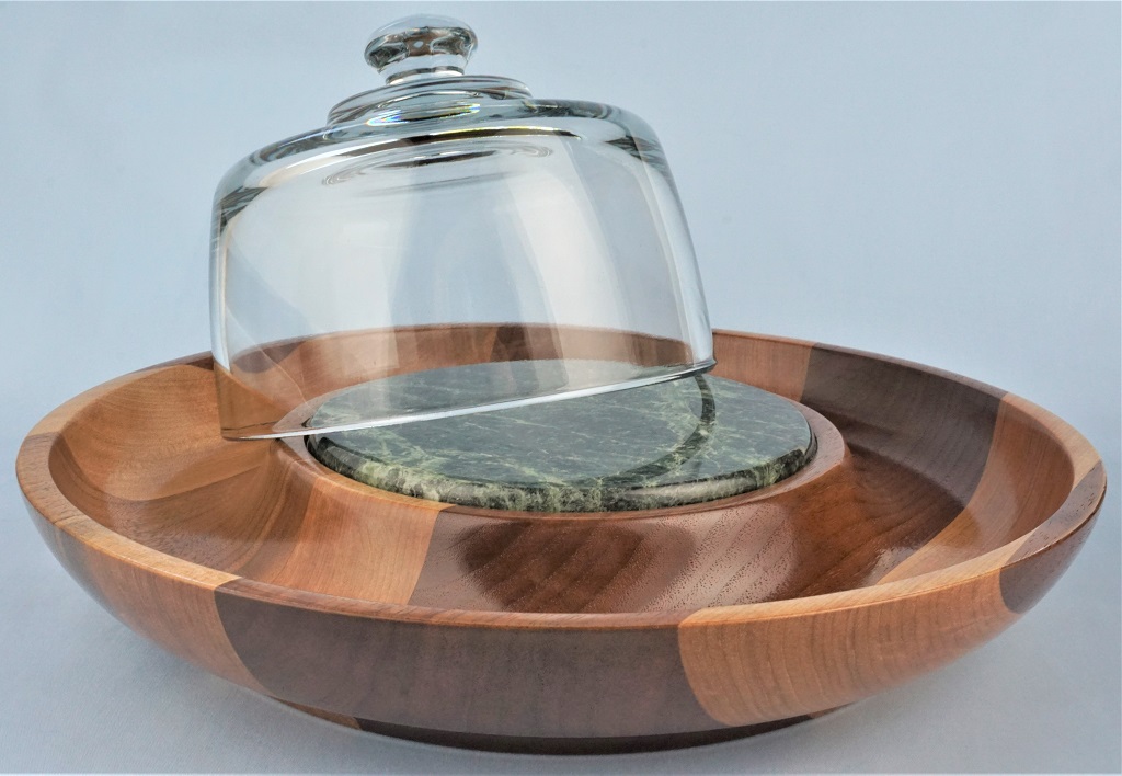 Our cheese trays are made using solid or laminated wood from native Canadian trees that have either died or fallen. The durable marble tile helps keep the cheese cool while the heavy duty glass dome (optional) help keeps the cheese fresh. The hollowed side make it easy to display the crackers and even keeps them in place until eaten. All cheese platters are finished with a food grade, highly durable gloss finish and are easy to care for.